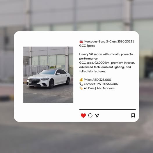 Mercedes-Benz S-Class S580 2023 | GCC Specs Luxury V8 sedan with smooth, powerful performance. GCC spec, 92,000 km, premium interior, advanced tech, ambient lighting, and full safety features. Price: AED 325,000 Contact: +971505619606 Ali Cars | Abu Maryam #fyp #mercedes #forsale #uae #مرسيدس رابط المنشور الأصلي على الفيسبوك: https://www.facebook.com/groups/1977199582552462/posts/122248173326137716/